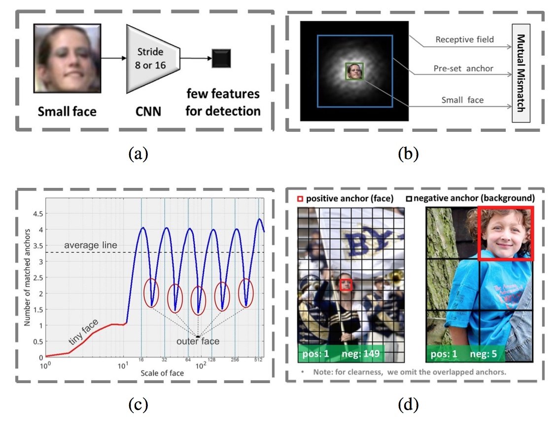 - 如图(b)所示,锚框与感受野的大小不能很好的匹配,同时锚框、感受野都不能很好的匹配到小尺度人脸区域;