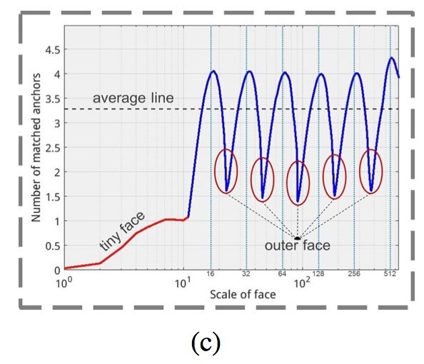 如图(c)所示,两个观察结果: 1)匹配锚框的平均数量约为3,这不足以召回高分数的人脸; 2)匹配锚框的数量与锚框的尺度高度相关。 远离锚框尺度的人脸往往被忽略,导致其低召回率。