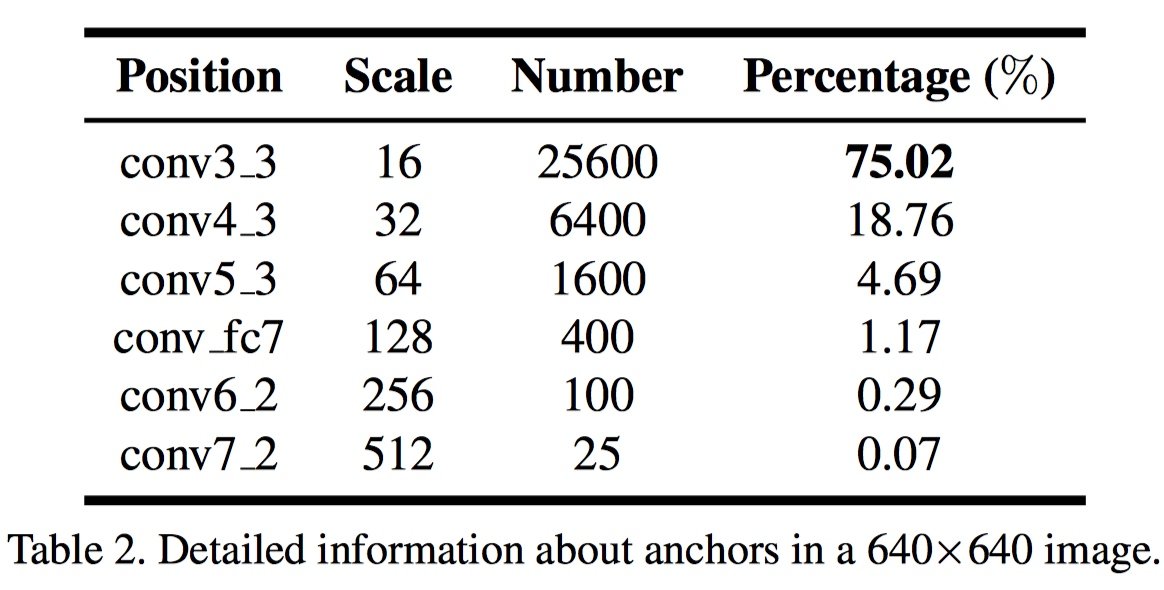 如 Table2 所示,对于一张 640×640 图像,总共产生了 34,125 个锚框,而 conv3_3 检测层贡献了其中约 75% 的最小锚框(16×16)。这些最小的锚框提高了小脸的检测率但也不可避免的导致了小脸的高假阳性率。