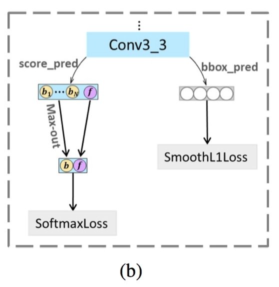 如图(b)所示,在conv3_3检测层对于每个锚框,我们同时预测一系列背景标签的 N_m 分数,然后选择置信度最高的作为其负样本最终分数,即 Max-out。Max-out 操作将一些局部最优解集成到 S3FD 模型中,减少了小脸的假阳性率。