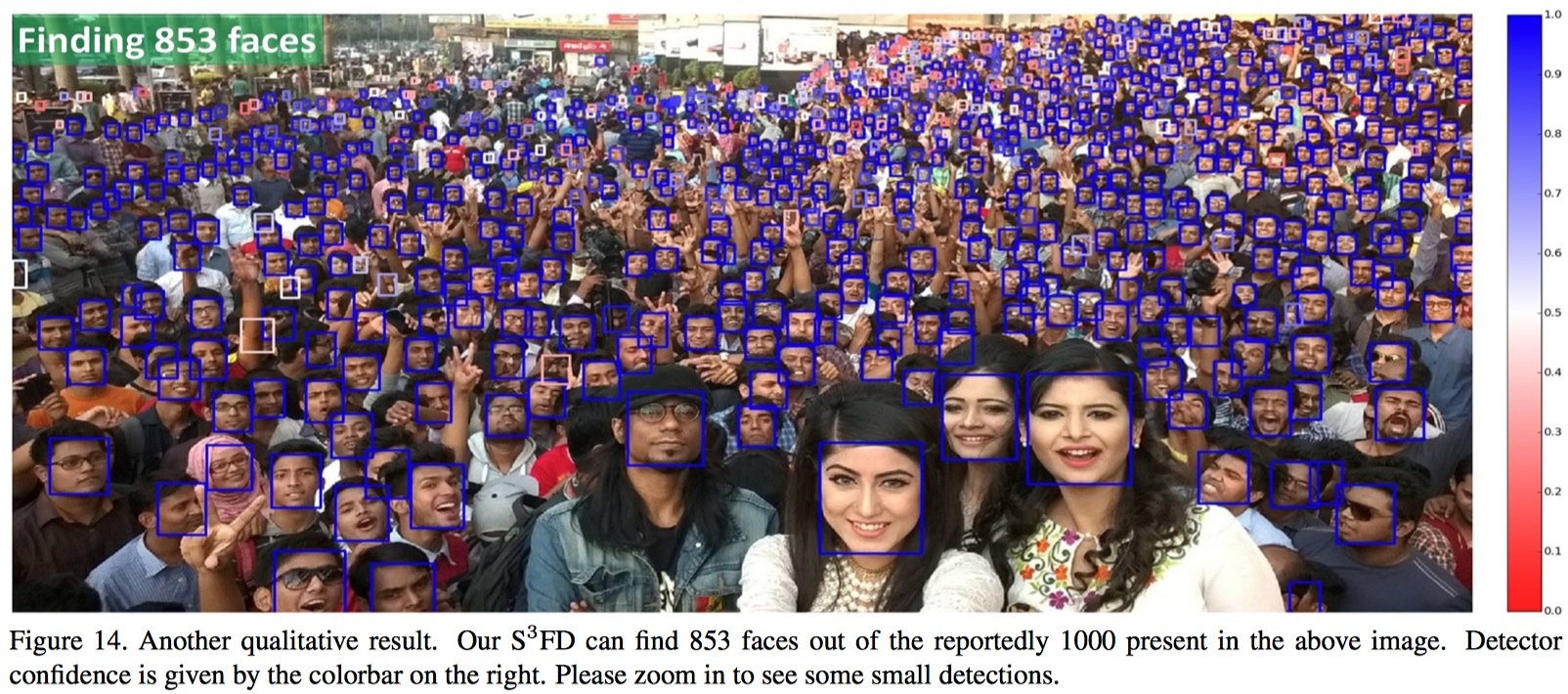 在这张共有1000张脸的全世界人数最多的自拍中,S3FD方法检测出了853张脸。