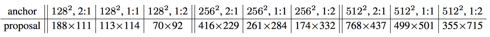 对于锚框,我们用3个简单的尺度,边框面积为 128x128,256x256,512x512,和3个简单的长宽比,1:1,1:2,2:1。注意到,在预测大建议框时,我们的算法考虑了使用大于基本感受野的锚框。这些预测不是不可能——只要看得见目标的中间部分,还是能大致推断出这个目标的范围。通过这个设计,我们的解决方案不需要多尺度特征或者多尺度滑动窗口来预测大的区域,节省了相当多的运行时间。下表是用ZF网络对每个锚框学到的平均建议框大小(s=600)。