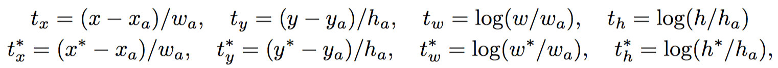 其中x,x_a和x^*分别表示预测框,锚框和 ground-truth 框。 这可以被认为是从锚框到附近的 ground-truth 框的边界框回归。