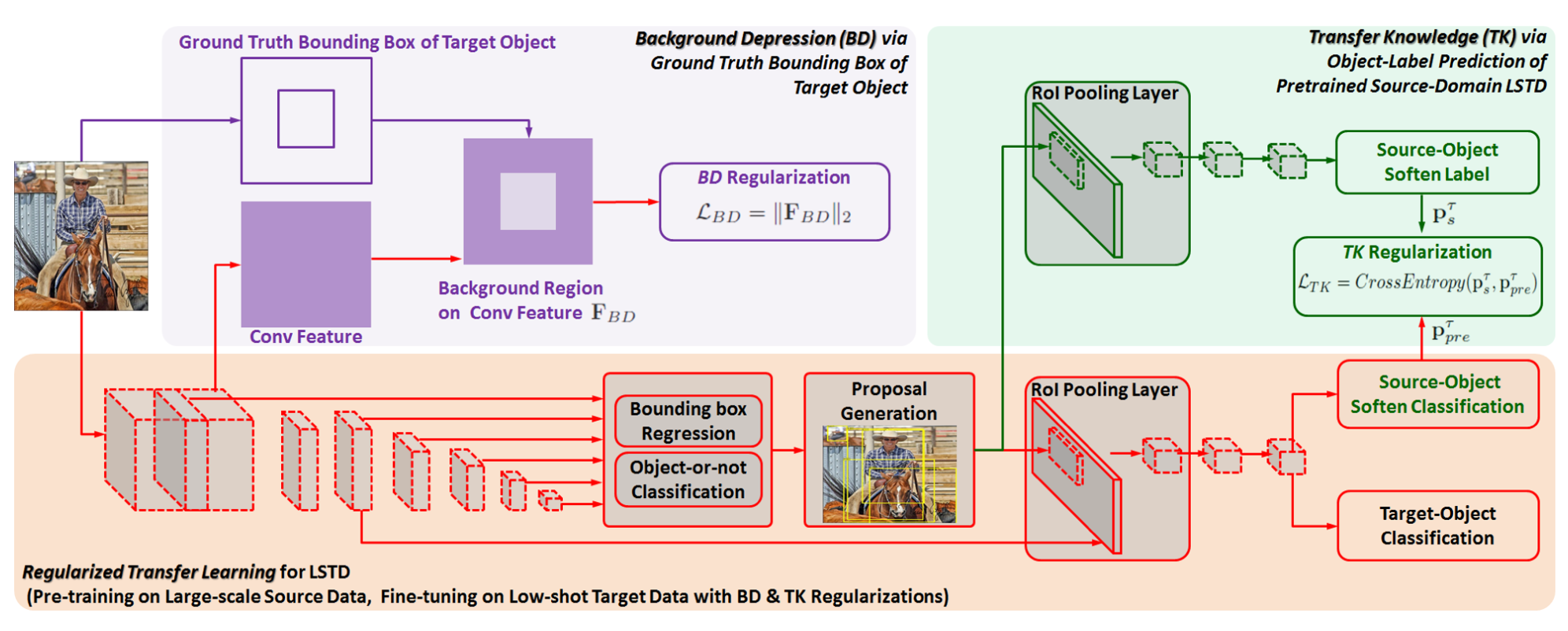 - 主要贡献:模型结构上整合了SSD和Faster RCNN;提出两个用于微调阶段的新的正则损失TK和BD,TK在候选目标中transfer源域标签知识,BD用目标的GTbox来做特征图额外监督。