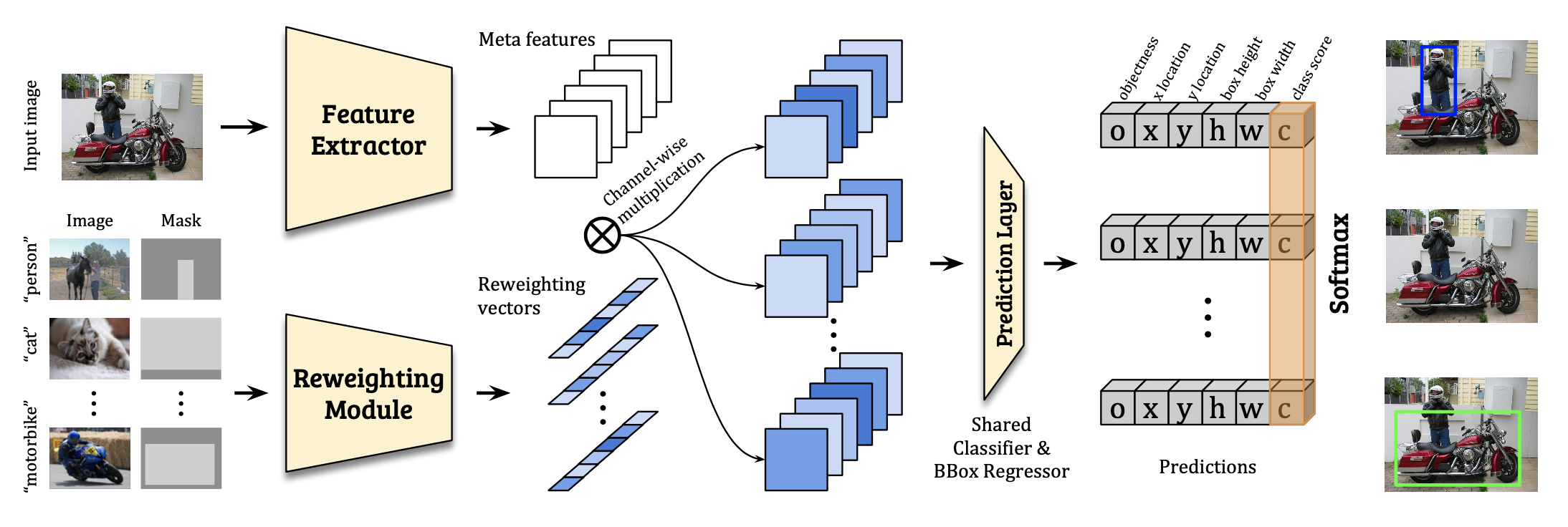 - 训练时用一个额外的 Reweighting Module 处理 support image+一个 0-1 mask,得到对应类别 vector,对 backbone 得到的特征做通道维度加权