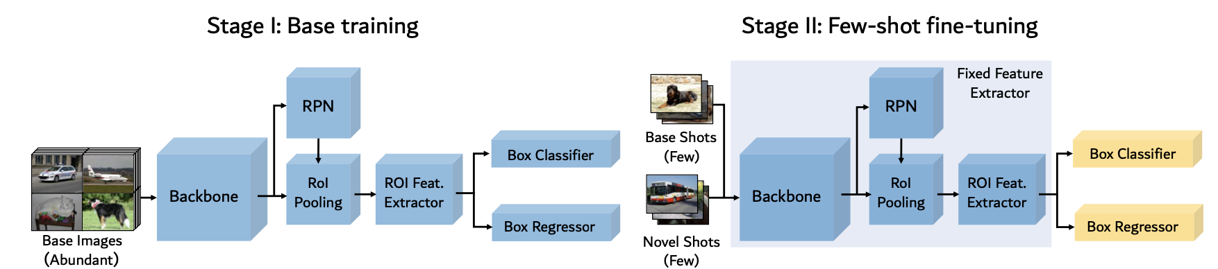 - 训练策略:只解冻三层:finetuned RPN 的 objectness 分支,novel 检测头的分类和回归层最后一层。
