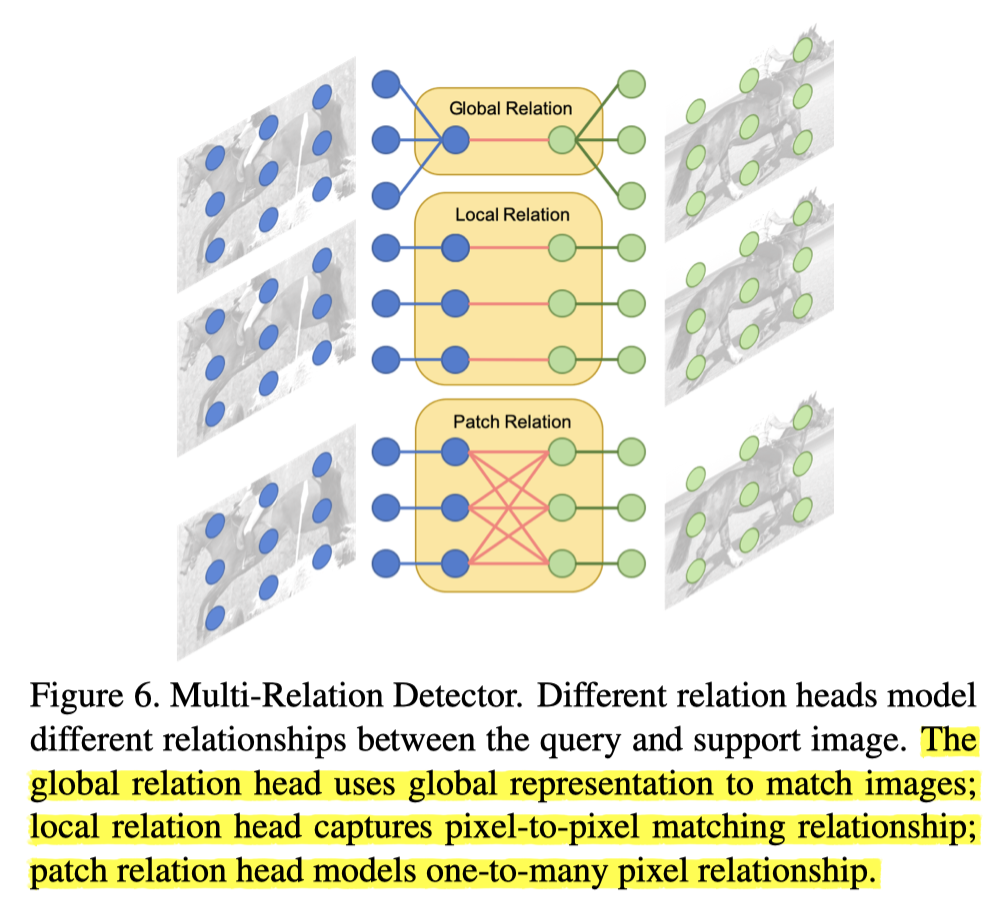 - Local Relation: 先对两个ROI特征图分别用weight-share的1x1卷积进行channel-wise操作,然后再进行类似于Attention RPN的操作,区别在于support image的ROI特征图不需要全局池化到1x1,而是直接以7x7的大小作为一个卷积核在query image的ROI特征图上进行channel-wise卷积,变成1x1xC,最后同样使用fc层得到预测相似度。