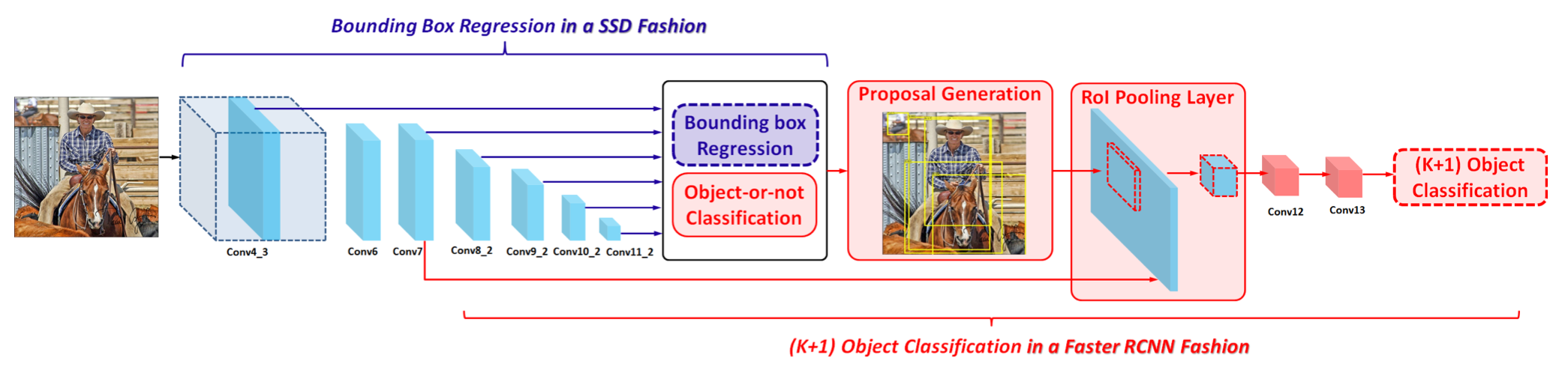 - 主要贡献:模型结构上整合了SSD和Faster RCNN;提出两个用于微调阶段的新的正则损失TK和BD,TK在候选目标中transfer源域标签知识,BD用目标的GTbox来做特征图额外监督。
