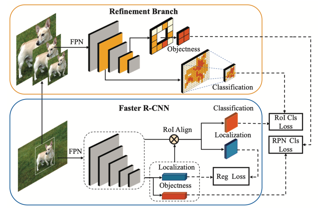 - 主要贡献:在常规模型上加了一个 Multi-Scale Positive Sample Refinement Branch,直接用 GT object 做图像金字塔,然后送入 FPN,取跟输入图像大小一致的 feature map 送进检测头,计算分类损失